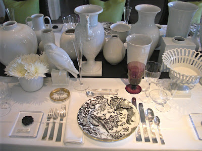 This table was one of my favorite things in the Showcase. The flatware is a Diaz-Azcuy design, and the violet stemware is beautifully mismatched and are set off against the white vases. They are also part of the designer's own collection. I love how the dinner plates, with their traditional black and white pattern, contrast with the caviar dishes...a simple rectangle of glass with it's own glass spoon.