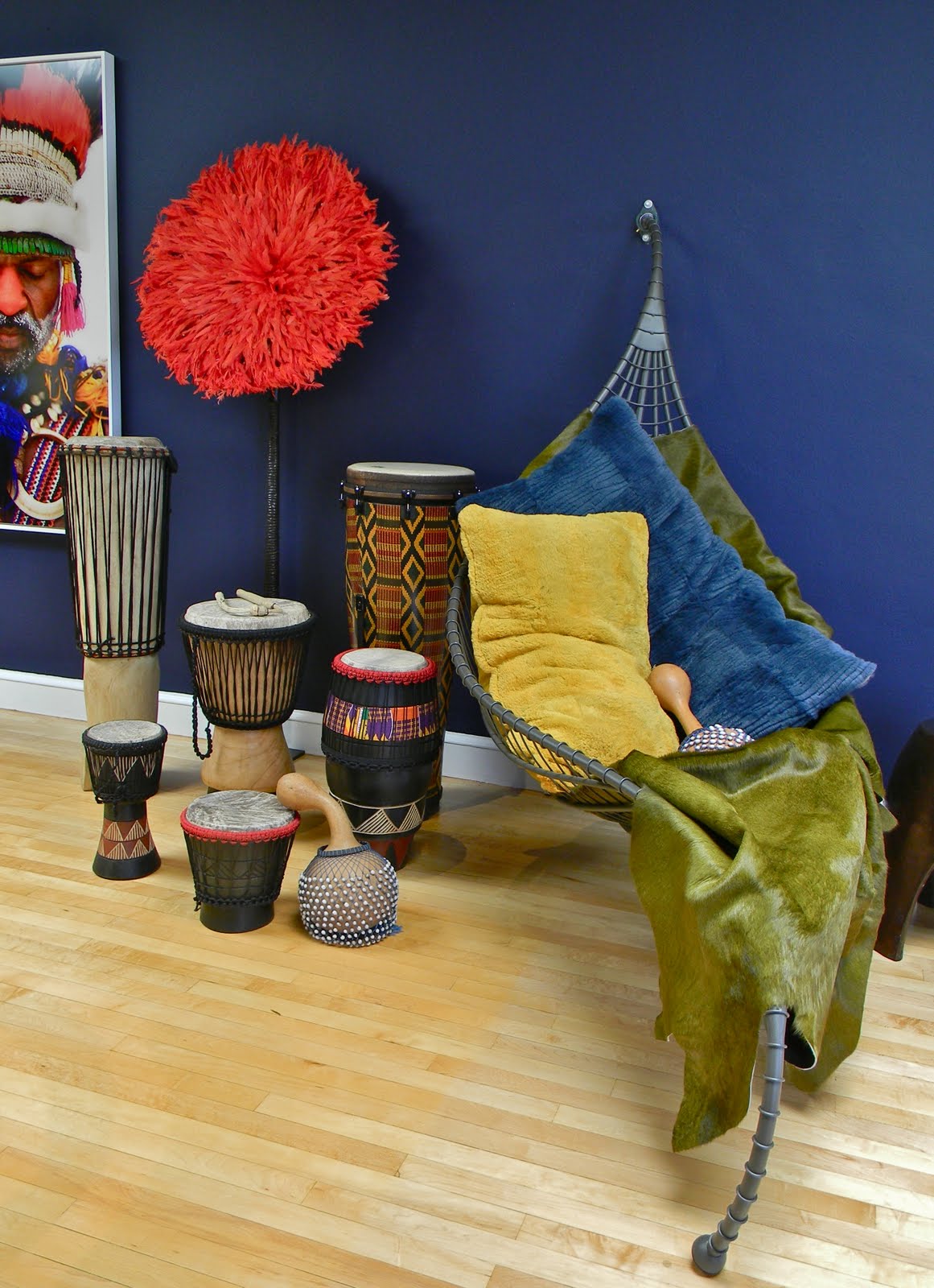Sultry Indigo Blue walls, and tribal art and accents keep this gallery room exciting and ready for anything. Thanks Jonathan for giving us a space dedicated to having fun!